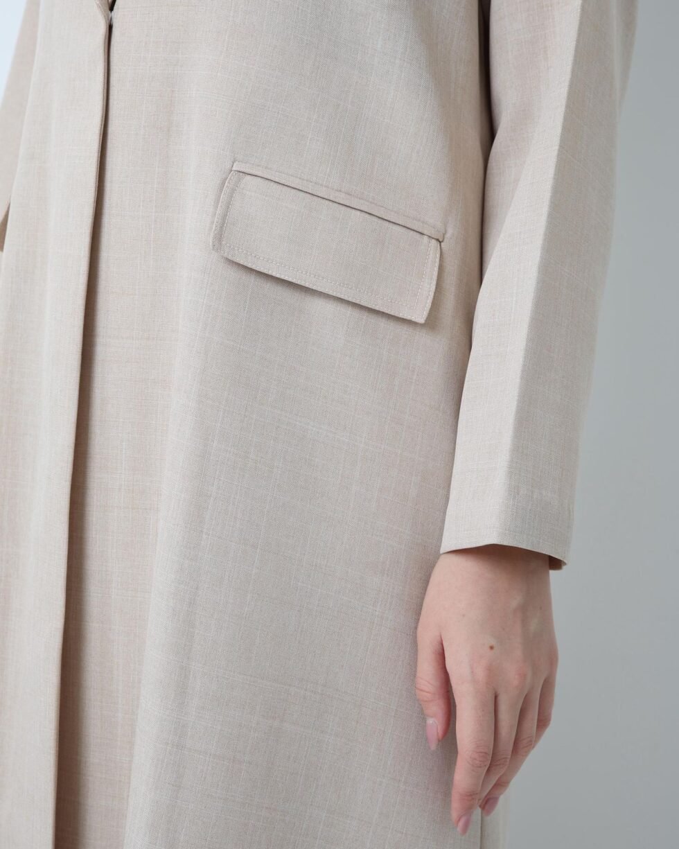 Fit: Straight, elegant, beltless, with a light collar and discreet pockets