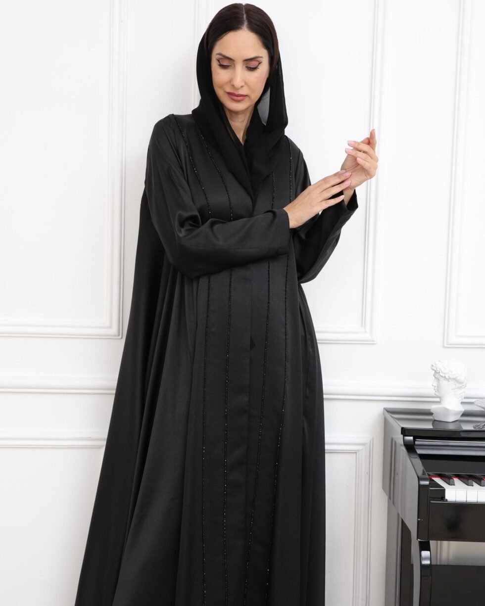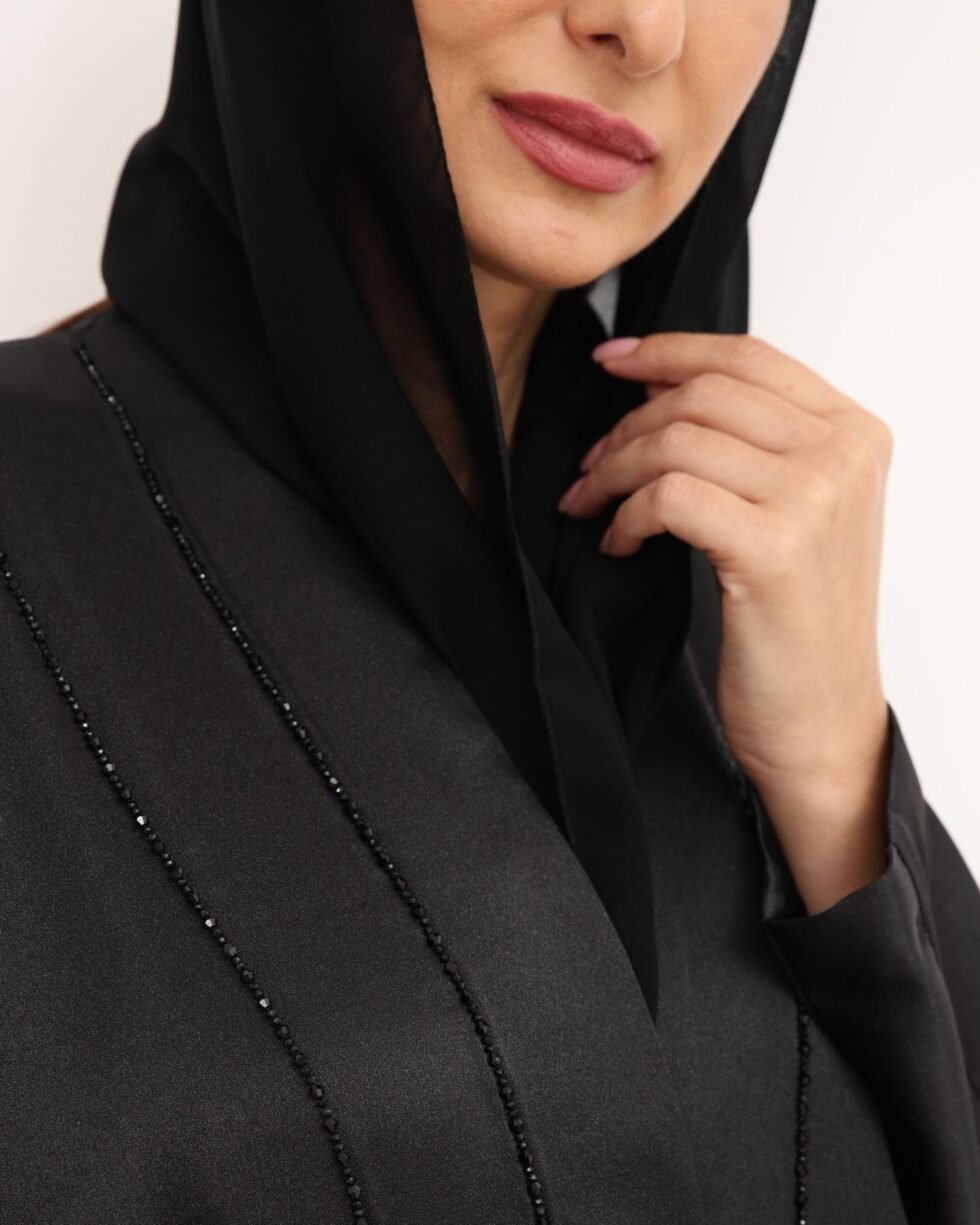 An exceptional piece decorated with finely worked pearls. Its delicate cut hugs the silhouette with grace, and each pearl adds a subtle shine. Perfect for parties or special events, this abaya embodies the discreet and refined luxury of Kalaam.
